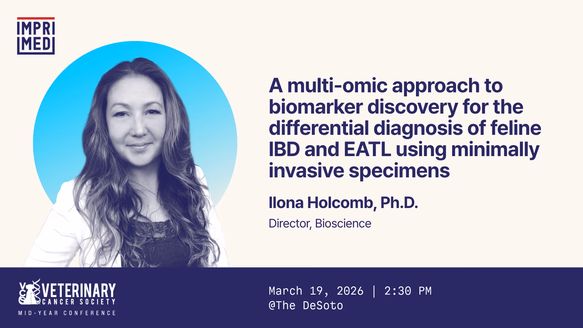 ImpriMed is exhibiting at the VCS–VSSO Collaborative Conference to showcase our AI-driven Personalized Prediction Profile (PPP) for canine lymphoma. In addition, our Director of Bioscience, Dr. Ilona Holcomb, will deliver an oral abstract presentation titled, “A Multi-Omic Approach to Biomarker Discovery for the Differential Diagnosis of Feline IBD and EATL Using Minimally Invasive Specimens” on March 19. We look forward to connecting with veterinary oncologists and surgeons to discuss advances in precision diagnostics and treatment planning.